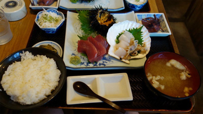 ここではマグロ、ホタテ、ウニの刺を頂きました。